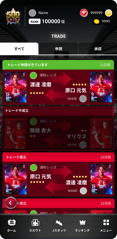 スカウトを行うことで豪華デザインのデジタルカードをGET。集めたカードは他のユーザーとトレードも可能。選手たちの様々なシーンを切り取ったカードを集めよう。