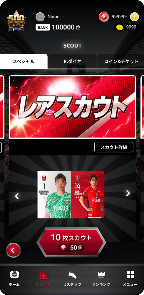 ・ダイヤを消費して、よりレアな「選手カード」を入手できる「レアスカウト」